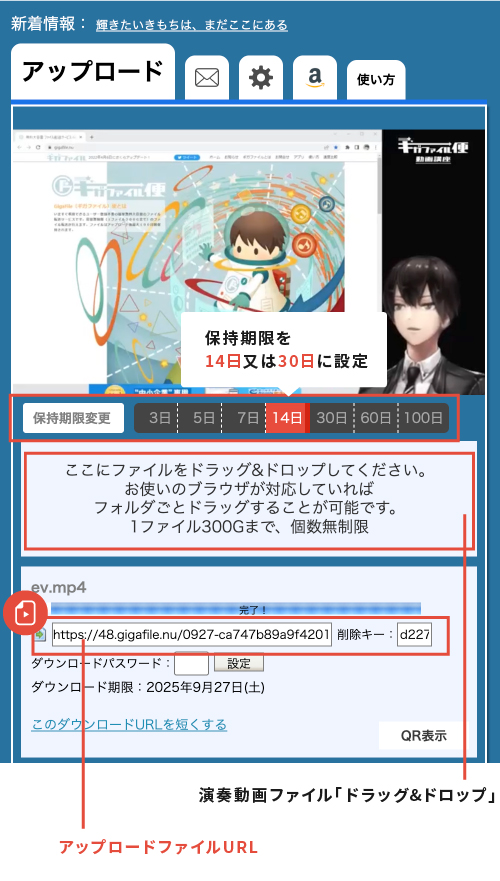 ギガファイル便アクセス後、ページ中段あたりでファイルのアップロード・送付URLの作成が出来ます。